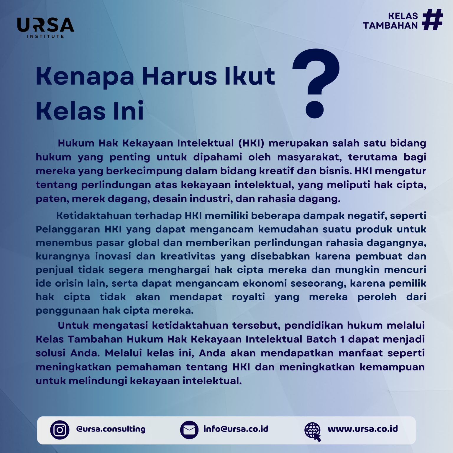 Kelas Tambahan hadir sebagai wadah pembelajaran secara daring yang bersifat dua arah yang membahas materi seputar ilmu hukum dengan menggunakan metode yang lebih fleksibel, karena peserta dapat belajar dan berdiskusi secara langsung dengan para pengajar yang ahli di bidangnya. Selain itu, terdapat juga latihan soal, kuis, dan ujian di setiap tingkatannya. Kelas ini akan dibawakan oleh pengajar yang berkompeten di bidangnya, yakni Ibu Deslaely Putranti, S.H., M.H.