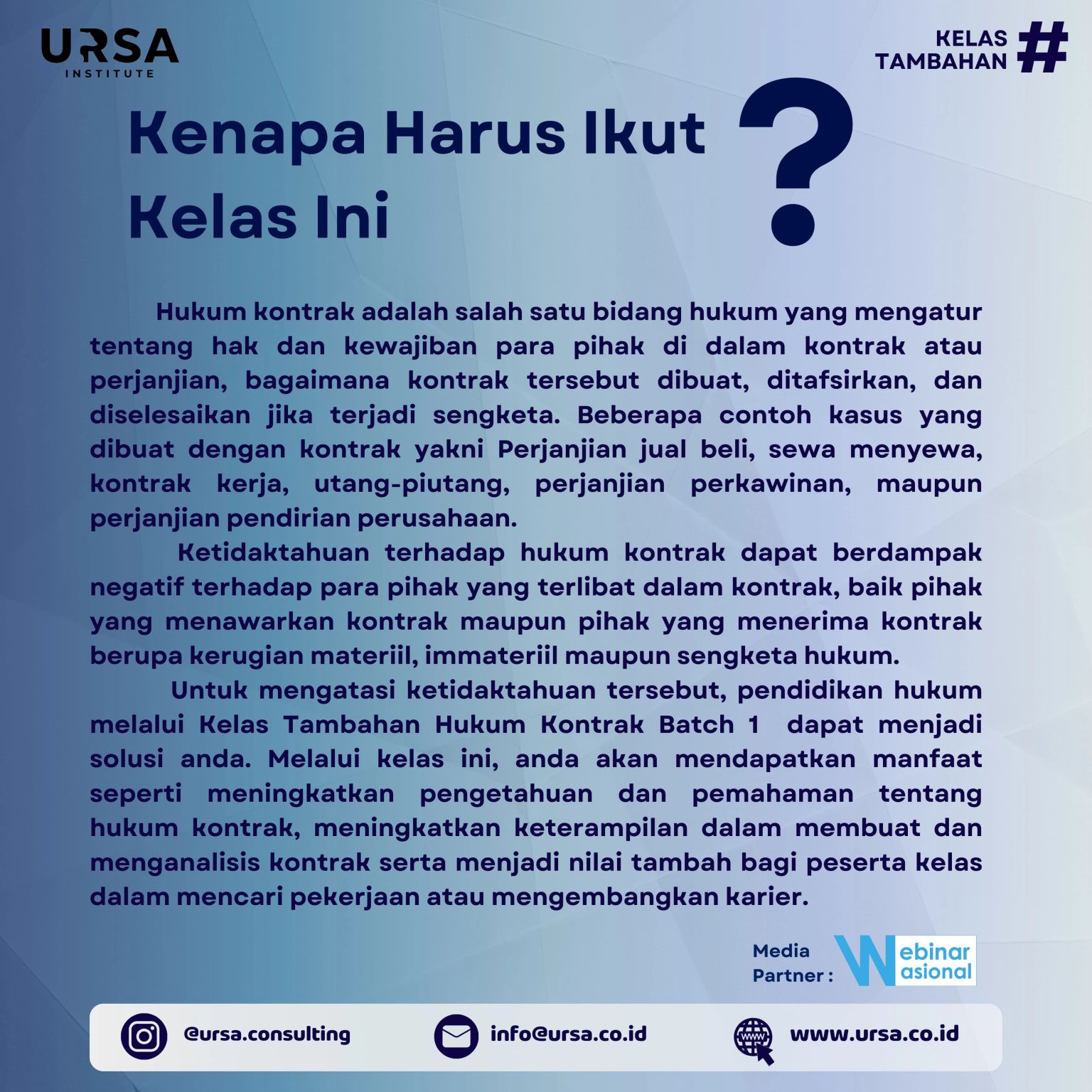 Kelas Tambahan hadir sebagai wadah pembelajaran secara daring yang bersifat dua arah yang membahas materi seputar ilmu hukum dengan menggunakan metode yang lebih fleksibel, karena peserta dapat belajar dan berdiskusi secara langsung dengan para pengajar yang ahli di bidangnya. Selain itu, terdapat juga latihan soal, kuis, dan ujian di setiap tingkatannya. Kelas ini akan dibawakan oleh pengajar yang berkompeten di bidangnya, yakni Bapak Bustanul Arifien Rusydi, S.H., M.H.